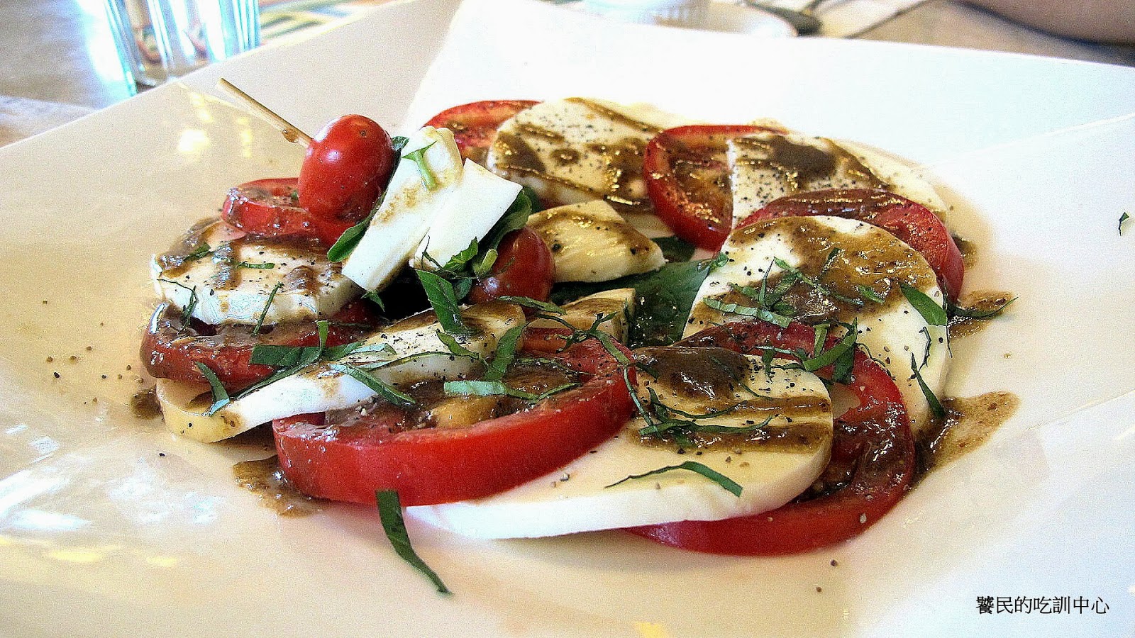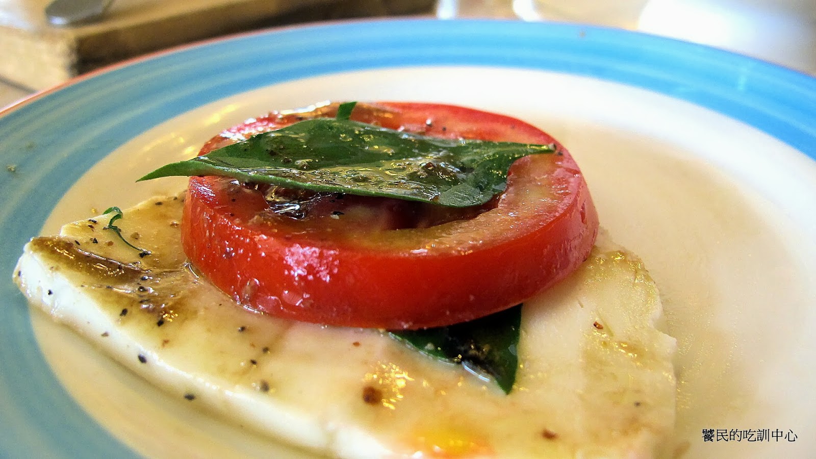 七到八塊的牛番茄,配上成雙成對七到八塊的白起司,以及聊聊數片羅勒葉,均勻塗抹的獨特醬汁,完全迥異於一般想像的蔬菜水果沙拉。