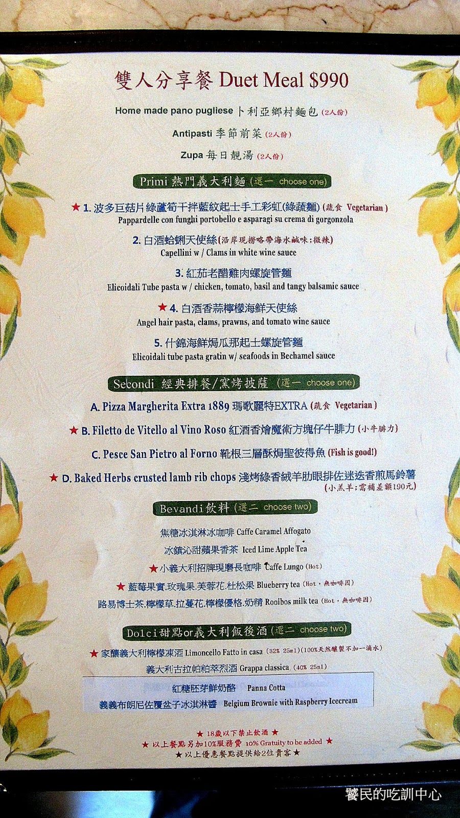 雙人分享餐,有麵包+前菜+湯+義大利麵+[排餐/披薩]+飲料+[甜點/餐後酒]。