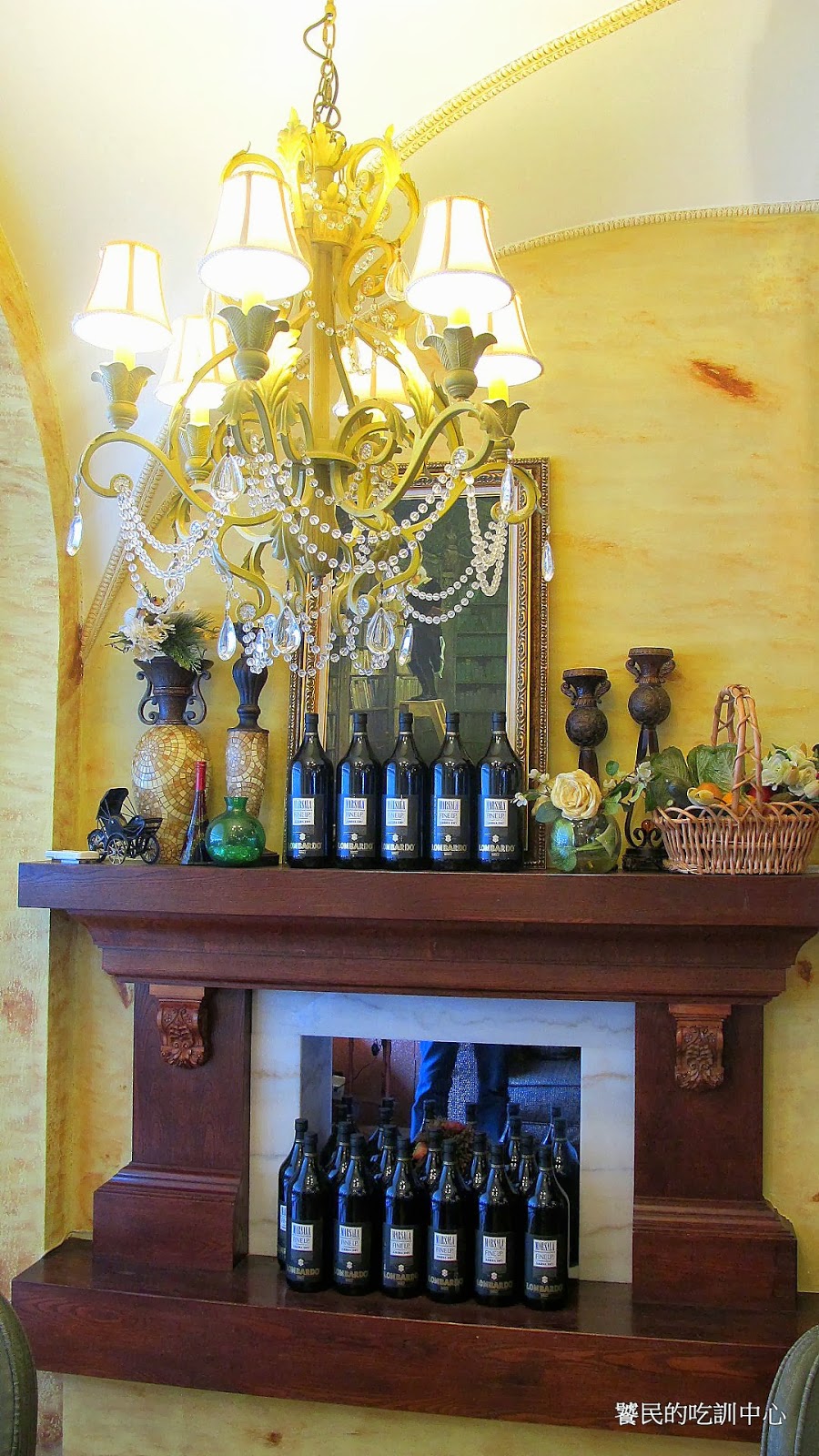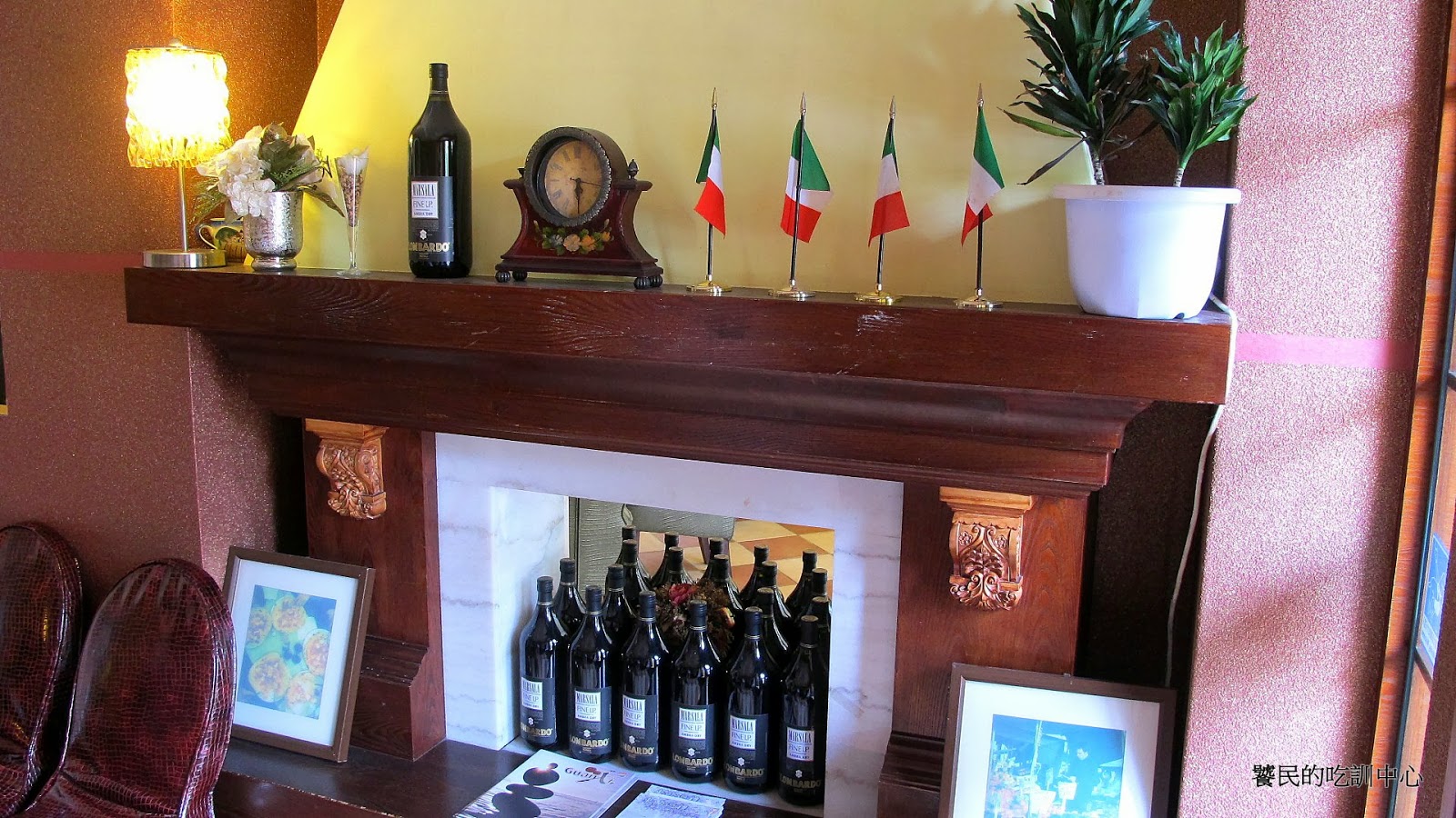 刻意做低的天花板,深咖啡色壁爐裝飾,上面插了義大利小國旗,簡單壁畫,塑膠盆栽,老舊時鐘,原本放柴火的地方改放紅酒瓶,再放上幾個咖啡色椅子做配色呼應。