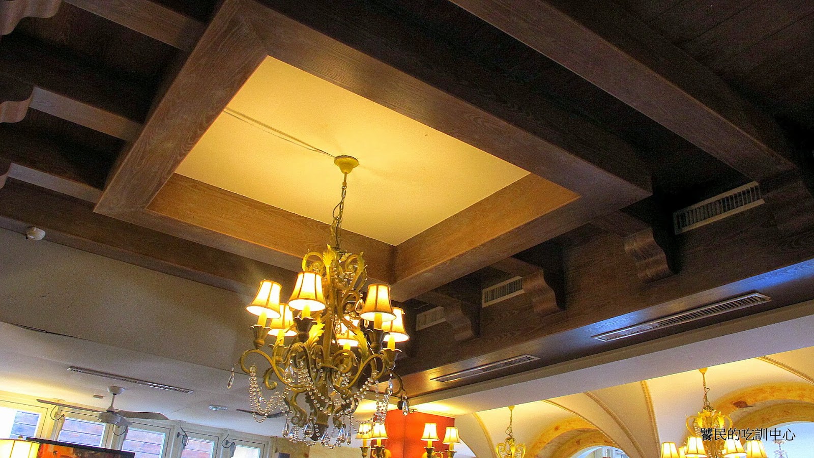 深色木樑配合高級掛燈,做出光影,其中再深藏中央空調的作法,一些較高級的餐廳也常常使用。