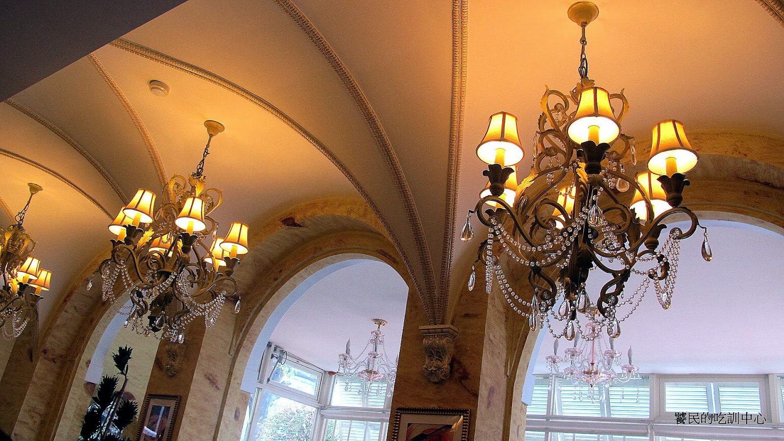 兩個方位的落地窗,讓陽光直接灑入,西洋棋圖案地板,豪華掛燈,以及義大利建築常使用的拱型梁柱,忍不住一直拍一直拍。