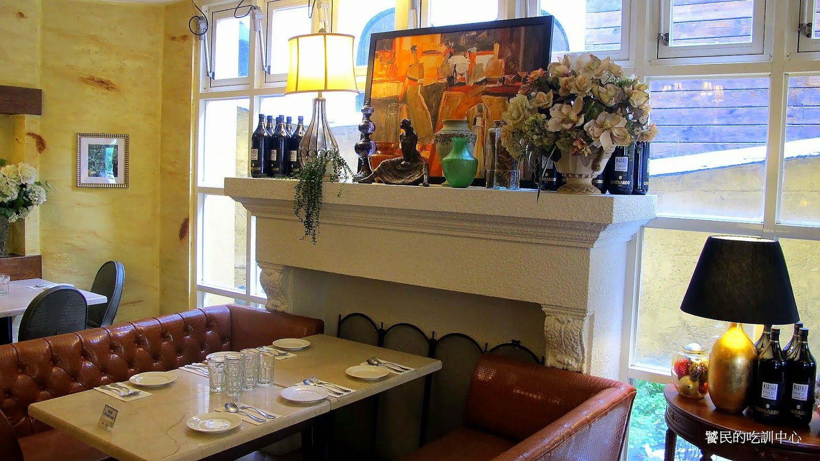 小義大利一樓靠窗的位置很夯,不用預定的話幾乎沒辦法享受到。裝潢也是壁爐造型,搭配塑膠盆栽和壁畫。感覺沙發椅好像太矮了,高個子的客人不知方不方便。
