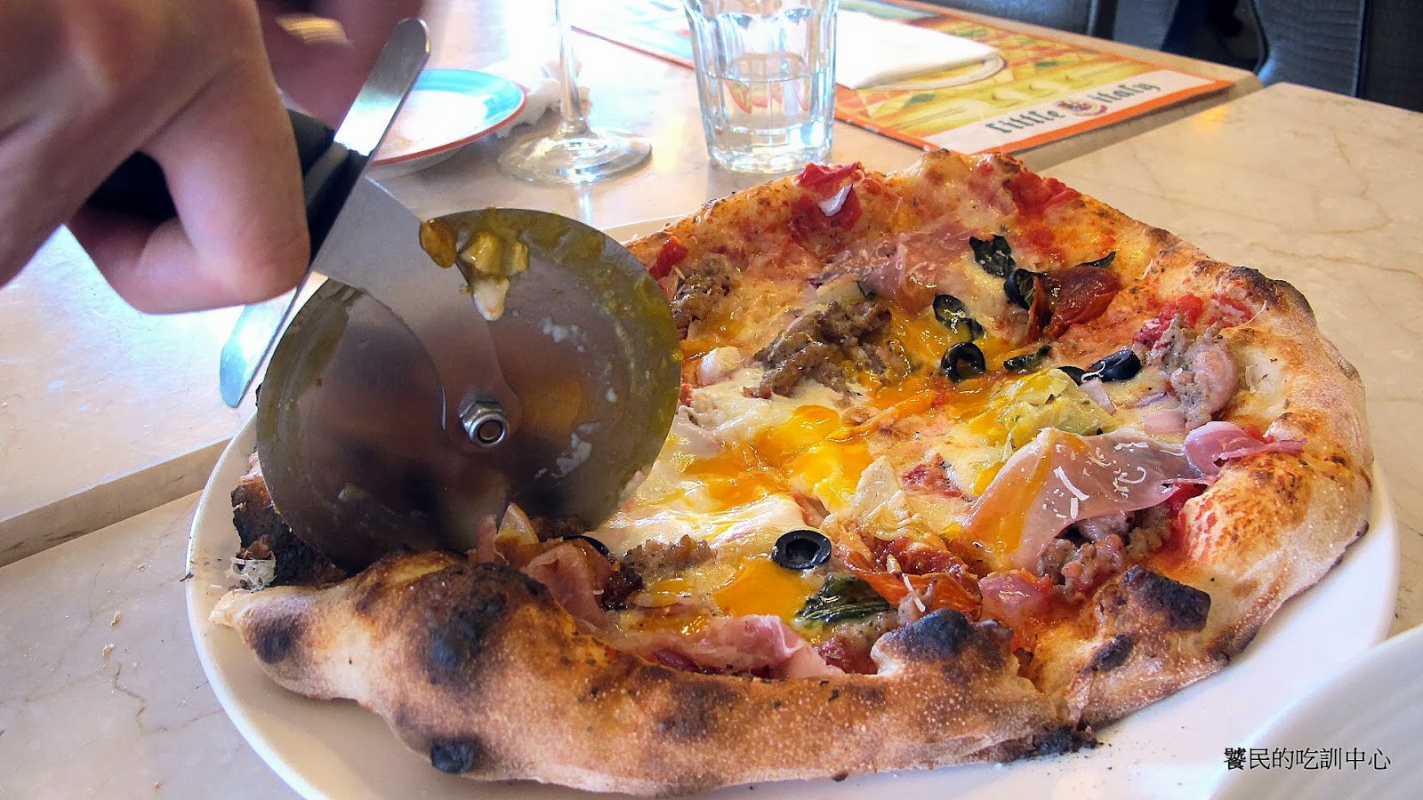 店員賣力的切,我們在旁邊也看得起勁。雖然滾輪披薩刀看來威武,但實際上要把披薩完全切開,並不如切蛋糕般輕鬆順手,也是需費不少力氣。整個流程大概花2-3分鐘,我則有點後悔怎麼沒有全程錄影下來。