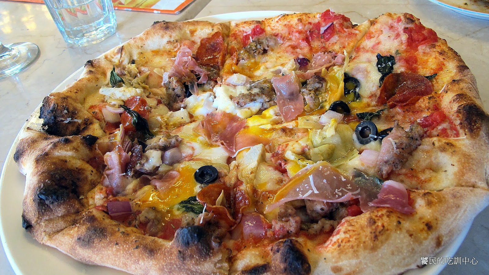 完成之後如下圖。披薩上蛋汁四溢,仍然沒有完全凝固。黑橄欖與火腿在外圍成一圈,更外圍的餅皮烤得酥脆焦黑,這視覺效果不似太陽,更像是爆發中的火山口。