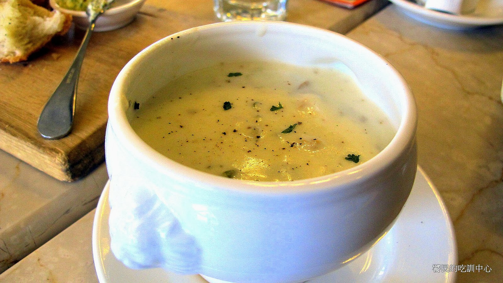 餐前麵包來了之後,再來個餐前濃湯做合體技。剛剛已經吃了不少的澱粉,再搭配濃郁香醇的濃湯,讓已在胃裡的麵包吸收湯汁,再度增加飽足感。